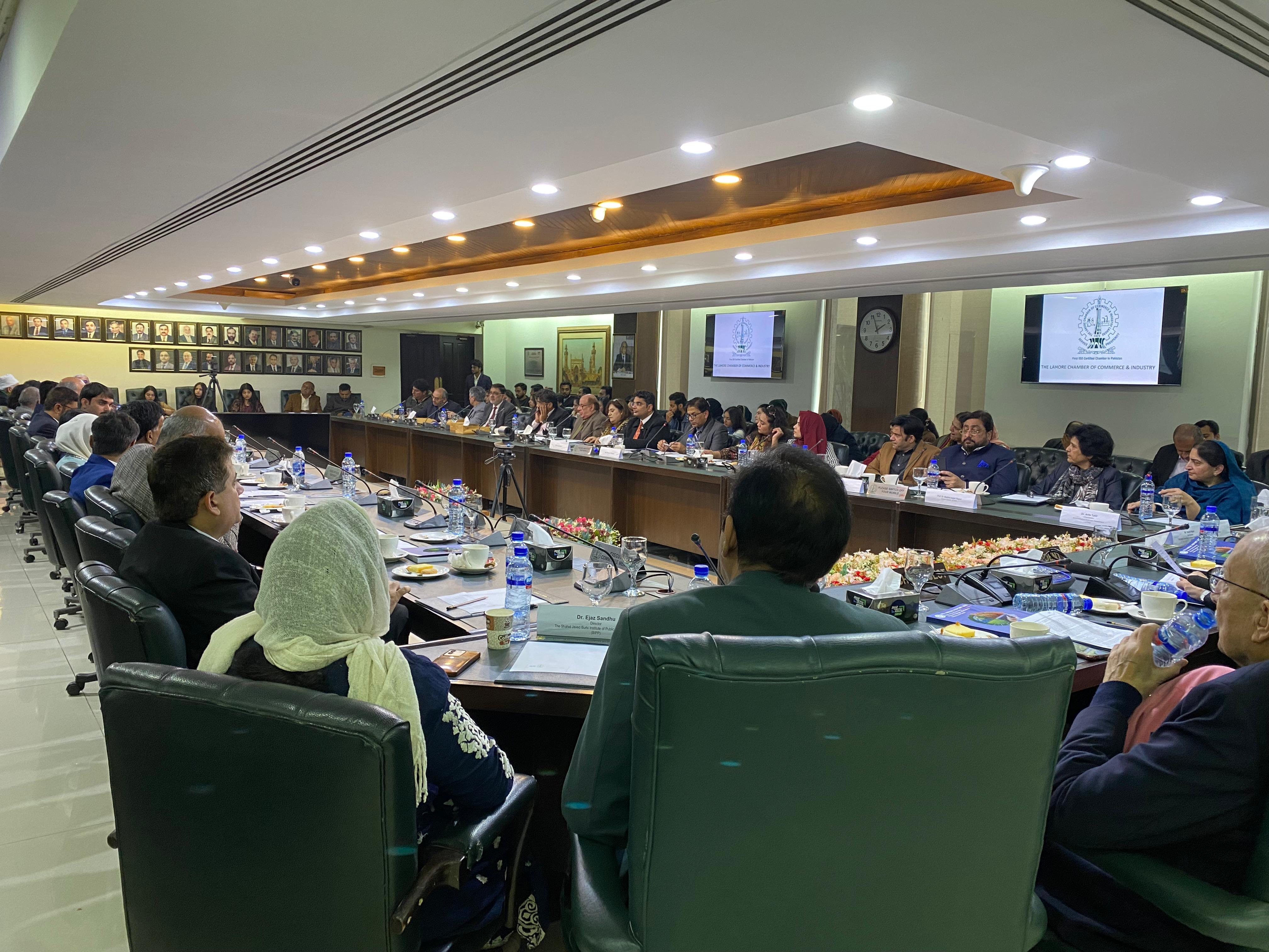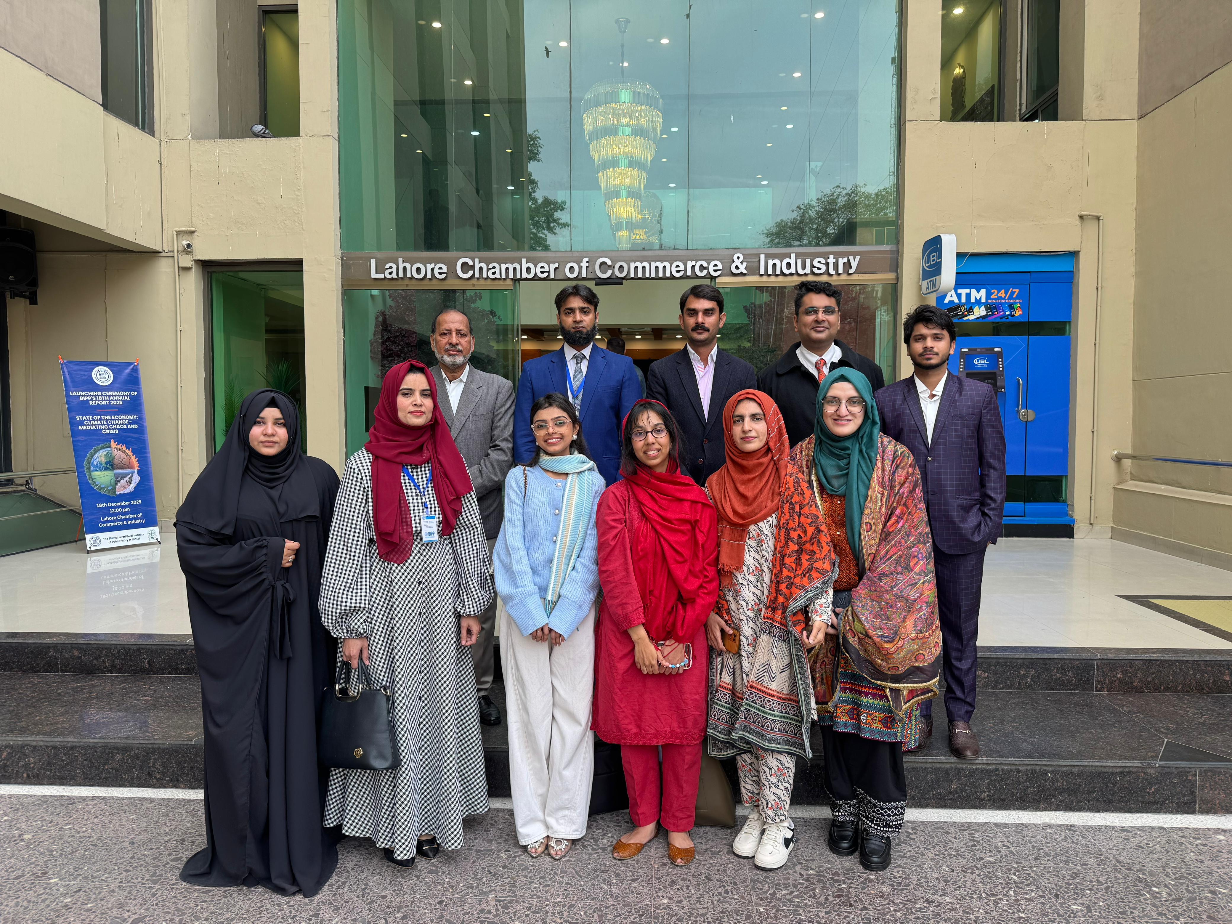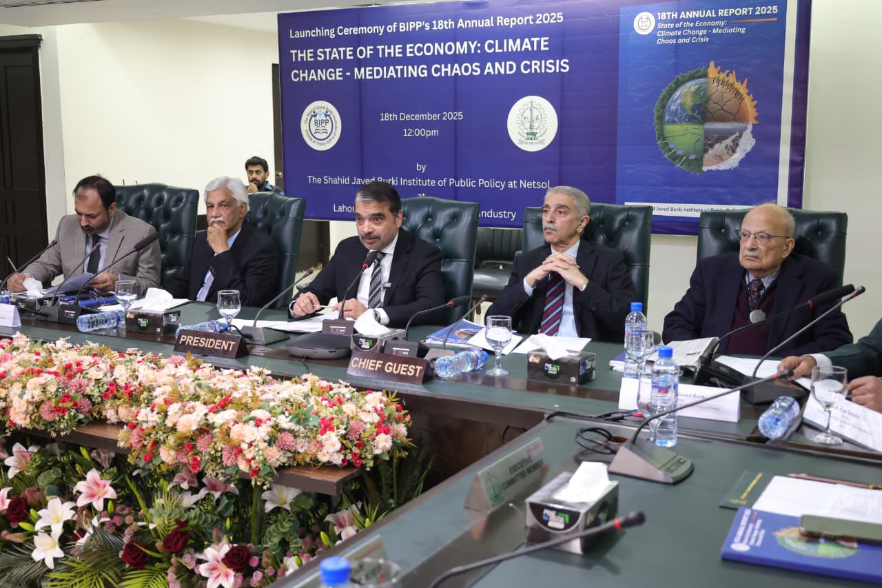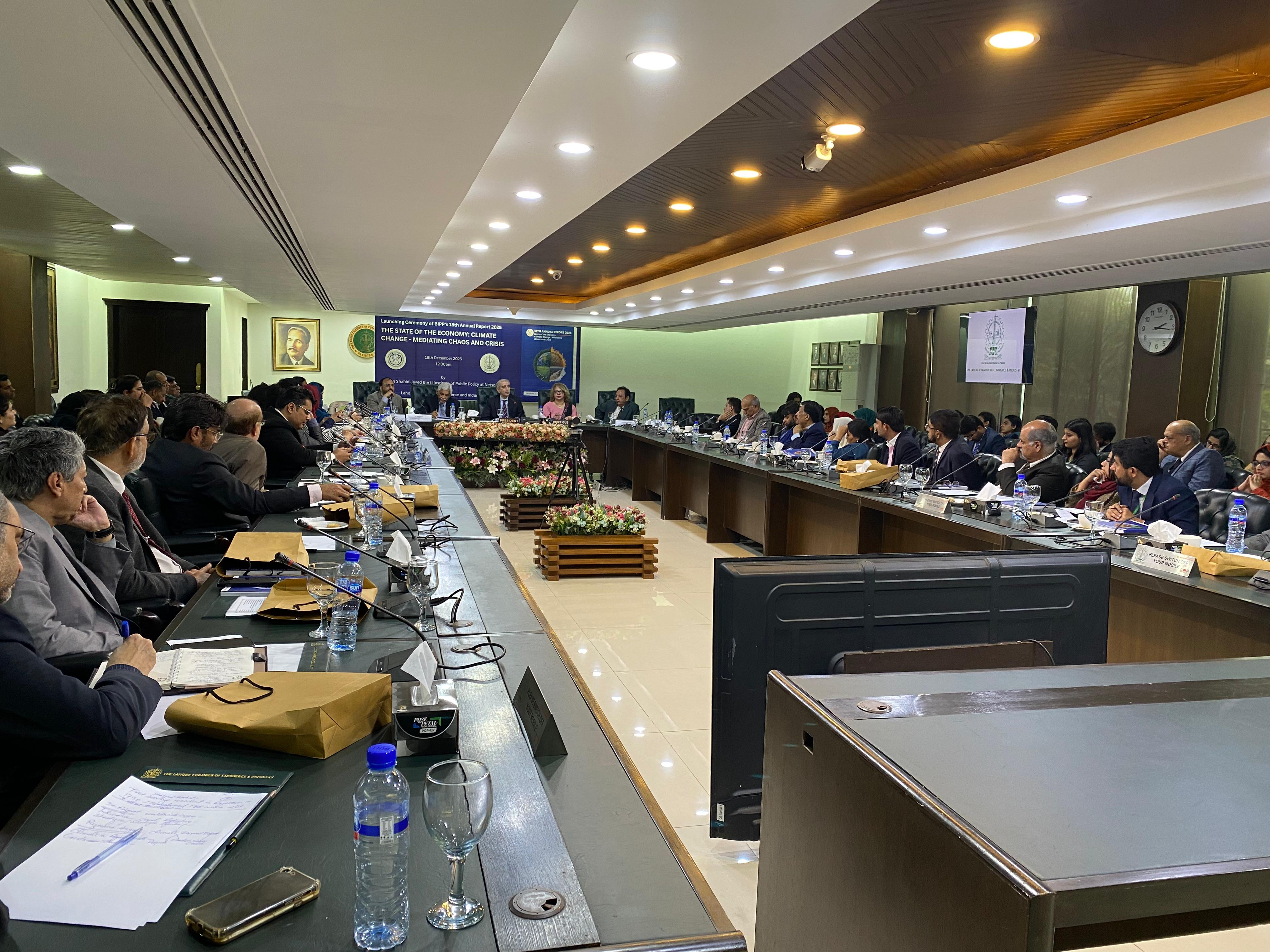 On 18th December 2025, The Lahore Chamber of Commerce and Industry (LCCI) hosted the launch of the 18th Annual Report of the Shahid Javed Burki Institute of Public Policy (BIPP), titled "The State of the Economy: Climate Change - Mediating Chaos and Crisis," bringing together leading economists, policymakers, academics, environmental experts, and members of the business community to examine Pakistan's growing economic and governance challenges arising from climate change. The event featured Mr. Shahid Hussain, Rector, Lahore University of Management Sciences (LUMS), as Chief Guest, and Ms. Rizwana Anjum, Team Lead, Green Credit Program, as Guest of Honour. Proceedings opened with a welcome address by Mr. Faheem ur Rehman Saigol, President, LCCI, followed by opening remarks from Mr. Shahid Najam, Vice Chairman, BIPP. Mr. Shahid Javed Burki, Chairman, BIPP, presented an overview of the report, while Dr. Farrukh Iqbal, former Executive Director, IBA Karachi, discussed the state of Pakistan's economy. Mr. Firas Shams, Research Fellow, BIPP, outlined key policy issues and recommendations, complemented by remarks from Prof. Dr. Shahid Munir, Vice Chancellor, UET; Dr. Arifa Tahir, Chairperson, Environmental Sciences, LCWU; and Prof. Dr. Bushra Inayat Rajput, Director General, KITAAS. The event concluded with a vote of thanks by Dr. Ejaz Sandhu, Director Research and Coordination, BIPP, as participants stressed the urgency of addressing climate change as a central economic challenge and emphasized the role of research institutions, academia, and the private sector in informed and sustainable policymaking.